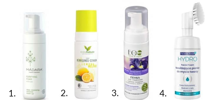 1. Madara, Kwiatowa pianka oczyszczająca | 2. Cosnature, naturalna pianka oczyszczająca 3w1 | 3. EO Laboratorie, Oczyszczająca pianka do mycia twarzy dla cery tłustej i problematycznej | 4. NovaClear, Hydro, nawilżająca pianka do twarzy