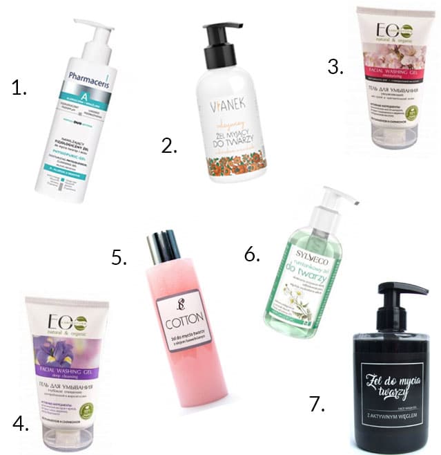 1. Pharmaceris A Physiopuric, nawilżający żel fizjologiczny do mycia twarzy, skóra alergiczna i wrażliwa | 2. Vianek, odżywczy żel do mycia twarzy | 3. EO Laboratorie Nawilżający żel do mycia twarzy dla skóry suchej i wrażliwej | 4. EO Laboratorie Oczyszczający żel do mycia twarzy dla skóry tłustej i mieszanej | 5. Scandia cosmetics, Żel do mycia twarzy Cotton | 6. Sylveco, rumiankowy żel do mycia twarzy | 7. Scandia cosmetics, Żel do mycia twarzy z aktywnym węglem